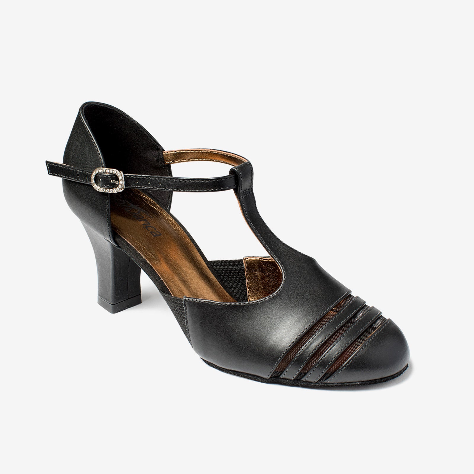 Bring a classic, sophisticated vibe to your next performance with this Salsa Ballroom shoe in sleek black leather. This stunning design features a supportive T-strap and an adjustable ankle buckle embellished with a touch of sparkle for that extra stage flair. The elegant closed-toe front is accented with breathable mesh inserts and stylish horizontal banding, while the professional suede sole ensures you have the perfect grip and glide for every salsa beat.