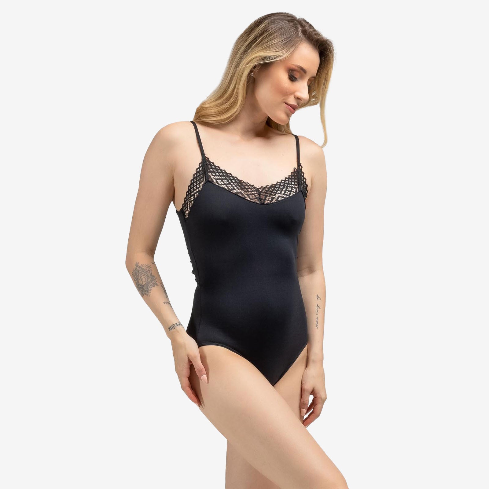 The Fleurine leotard elevates a classic camisole silhouette with geometric lace at the neckline and a dramatic lace back. Crafted in supple microfiber with a comfortable shelf lining, it offers a flattering fit, breathable feel, and a timeless ballet leg line.