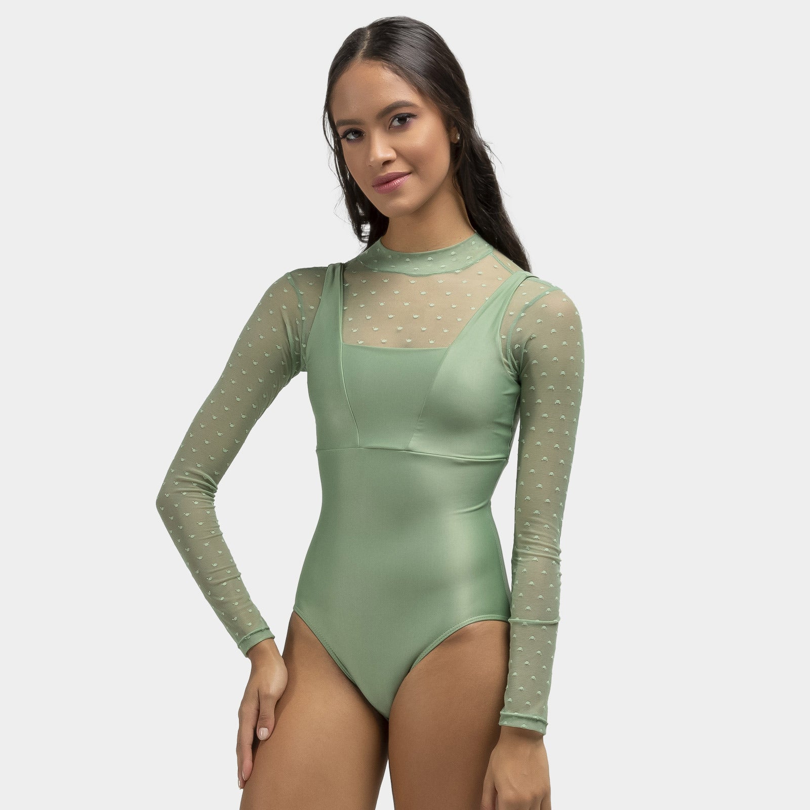 Romance meets sleek lines—Vittoria layers a sheer dot mesh over a clean, camisole-style bodice, finished with a dainty mock neck and oval keyhole back. Soft, stretchy microfiber moves like a second skin while the mesh adds just-enough drama for class, stage, or photos.