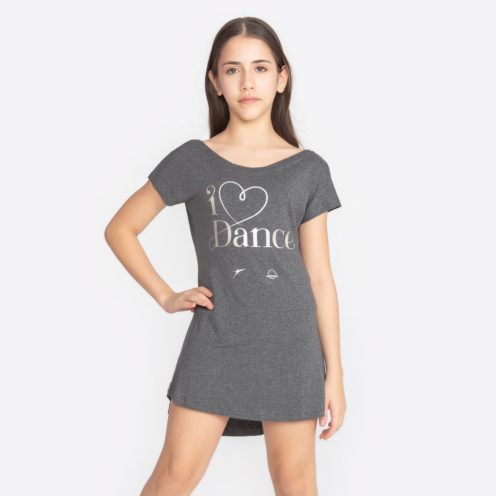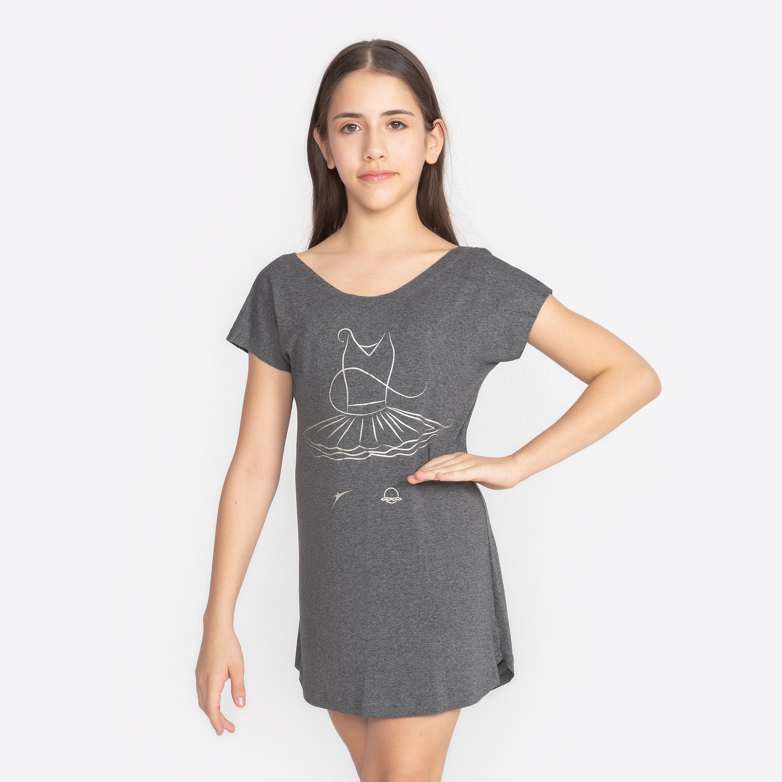 Elevate your rehearsal style with these ultra-comfy graphic dance dresses, designed to move as fluidly as you do. Featuring a chic off-the-shoulder neckline and a playful high-low hem, these versatile pieces work perfectly as a breezy warm-up or a stylish post-studio cover-up. Choose between the classic depth of solid black or the soft, textured look of heathered charcoal to match your mood. The silver-toned line art—ranging from elegant tutus to minimalist ballerina silhouettes—adds just the right amount of shimmer to your studio aesthetic. Whether you’re perfecting your pirouettes or just lounging between classes, these dresses prove that "effortless" is always in step.