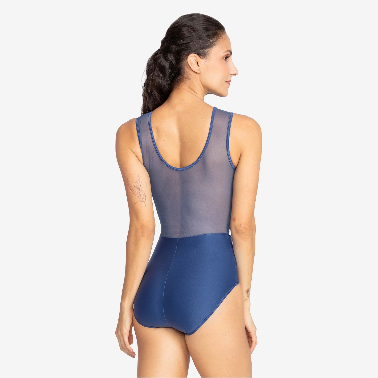 This Prussian Blue leotard is the perfect blend of athletic function and romantic charm, featuring a sheer mesh bodice overlaid with a delicate scalloped lace panel. The sleeveless design and high crew neckline create a sleek, streamlined silhouette that elegantly highlights the dancer's upper body. With its modern V-cut waistline and deep blue hue, this piece offers a sophisticated look that transitions seamlessly from the studio to the stage.