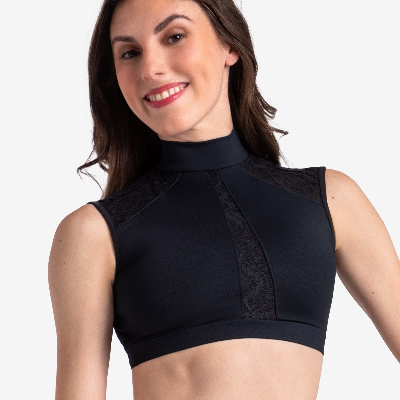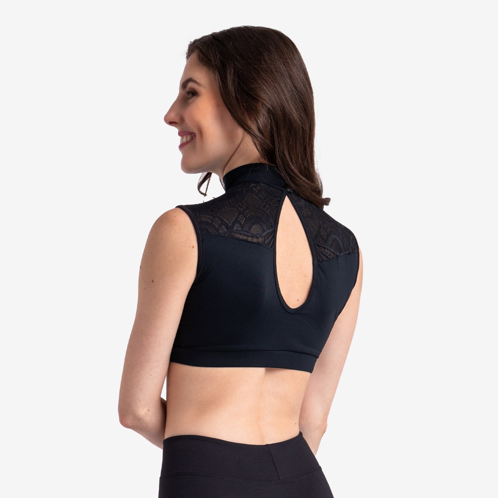 Meet Fancy Free Top, your go-to high-neck crop that twirls from barre to street. Sleek microfiber hugs while sheer lace panels and a keyhole back bring the drama—supportive, breathable, and totally stage-ready.