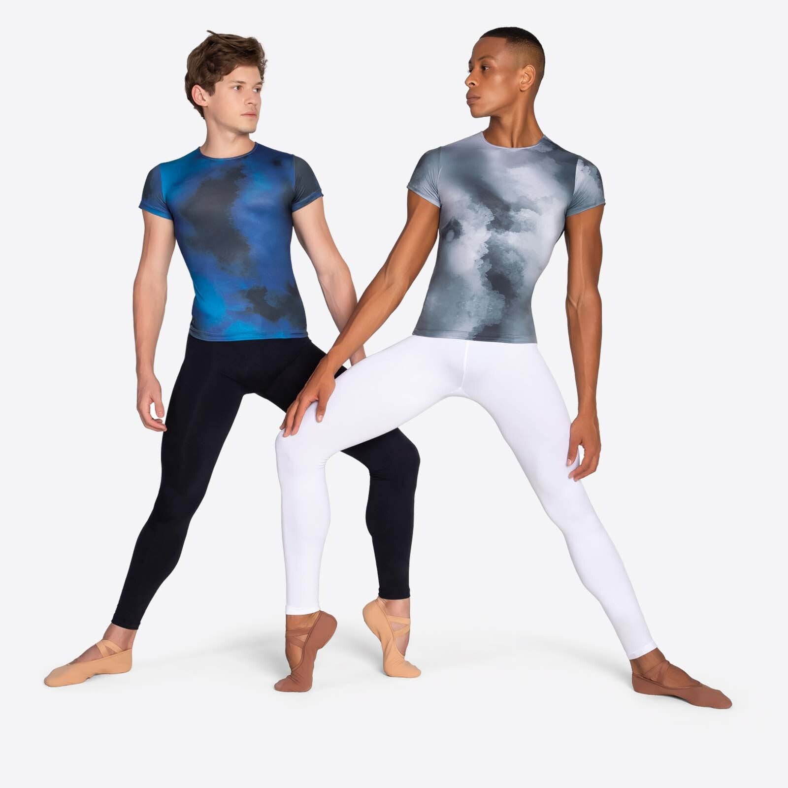 These classic, form-fitting black tights offer a streamlined and professional look designed specifically for the male dancer's physique. The high-quality, opaque fabric provides excellent coverage and support, allowing for a full range of motion during everything from powerful leaps to precise floor work. When paired with a coordinating blue-toned performance tee, these tights create a polished, athletic silhouette that is perfect for both intense rehearsals and studio performances.