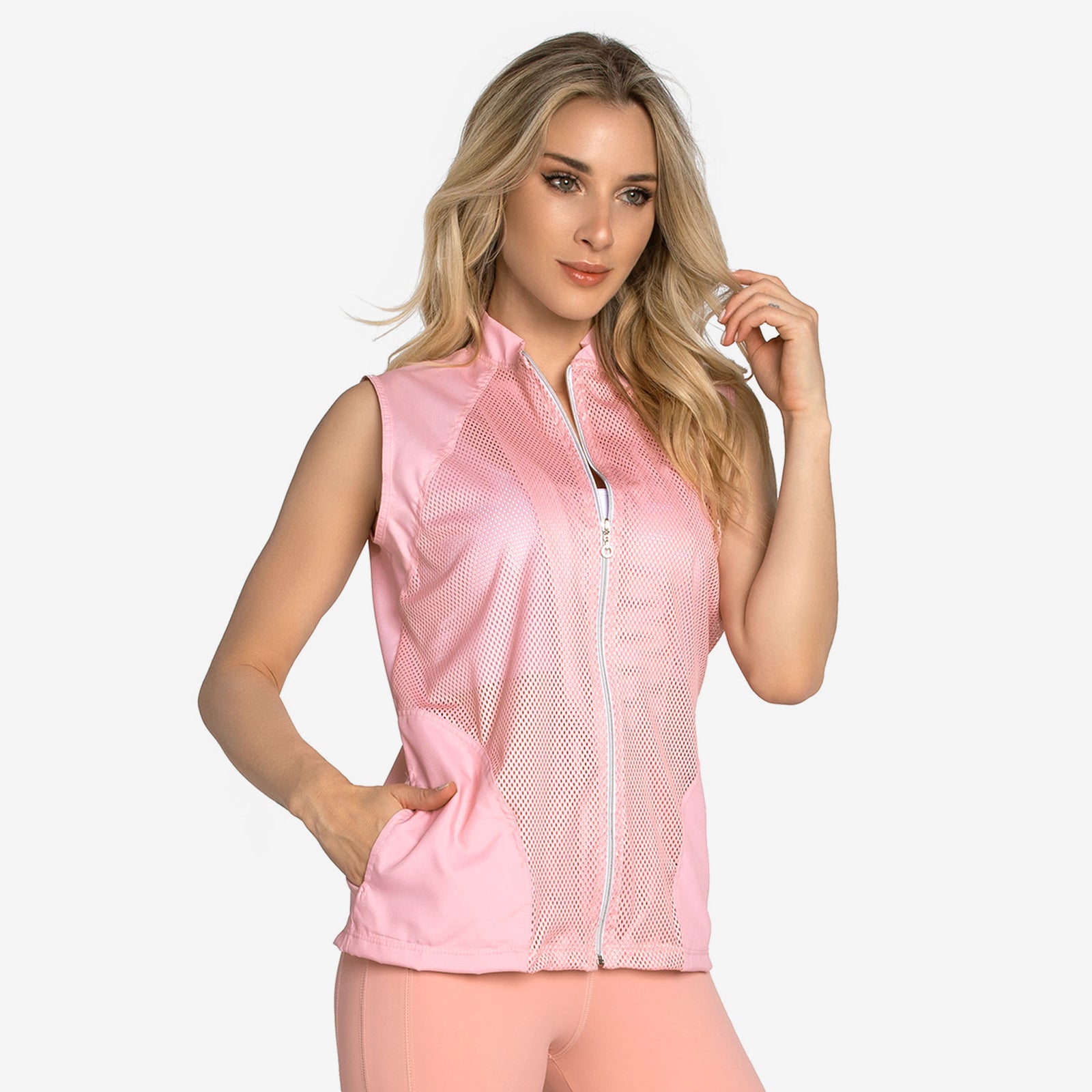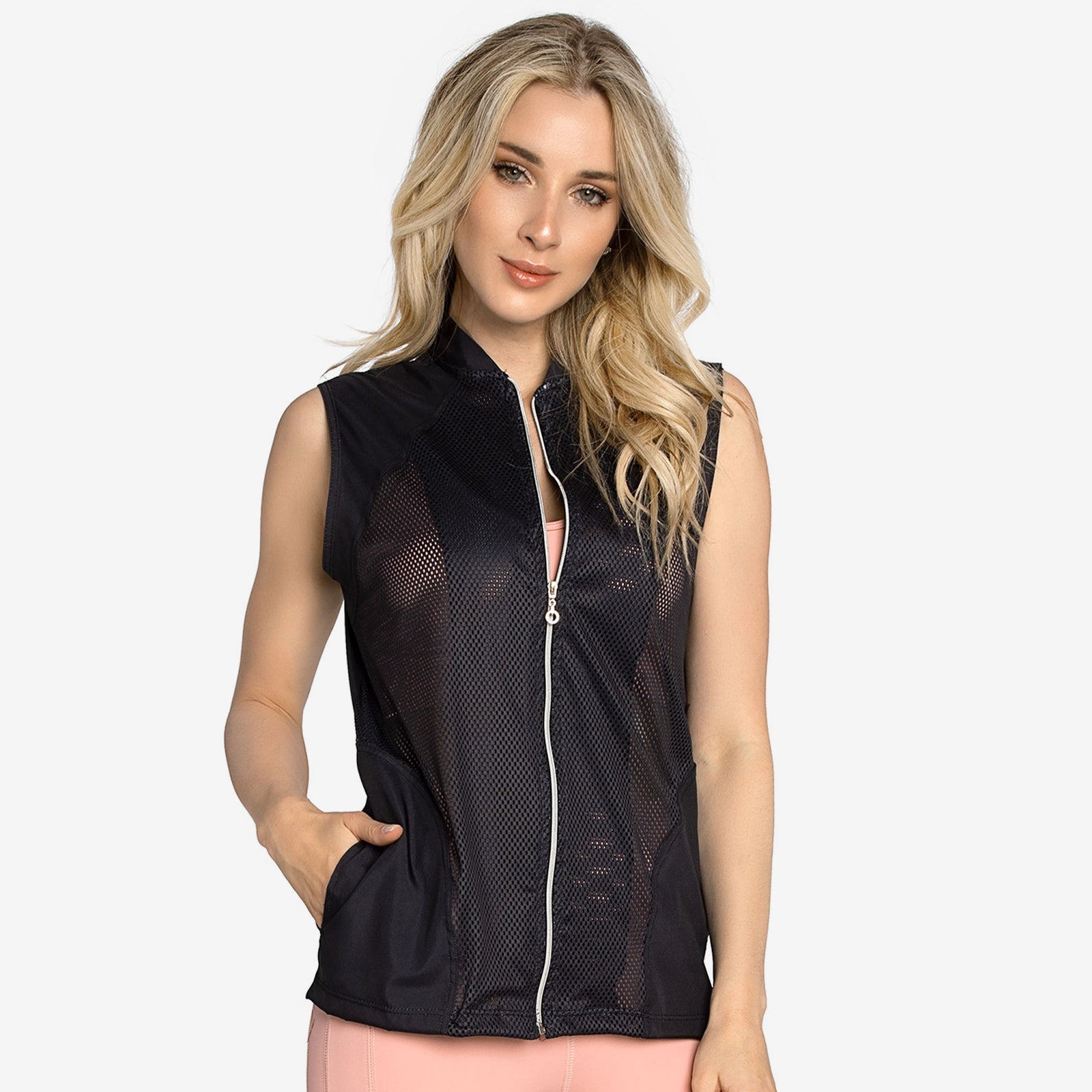 This vest is an ideal addition to your workout gear, providing lightweight, breathable comfort. Its streamlined design adds a stylish touch to your fitness look. Ready to layer up your workout with a cool twist? This black mesh vest is the perfect piece to throw on when you need a little extra coverage without sacrificing breathability. With its sleek, high-neck design and easy front zip, it's the ultimate sporty-chic finisher that says, "I'm here to work out, but I'm going to look fabulous doing it." It's so light, you'll feel like you're wearing a stylish cloud!