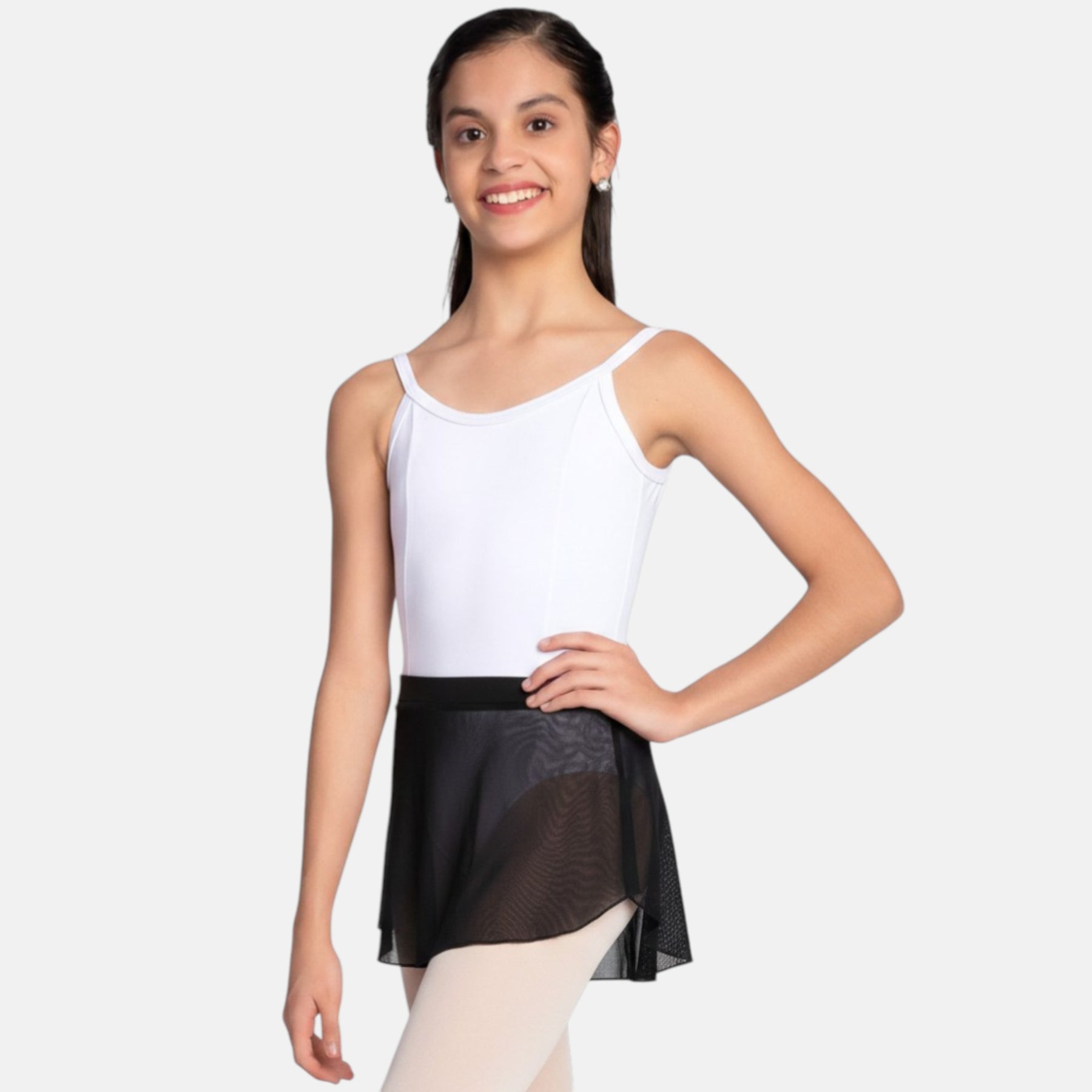 This chic little mesh skirt is the perfect "finishing touch" for any aspiring prima ballerina! Featuring a high-low silhouette, it offers a classic look in the front while the extra length in the back creates a beautiful, flowing effect during leaps and turns. The sheer black fabric adds a dash of sophisticated drama to a simple leotard, making it feel just a bit more professional. Whether she's practicing at the barre or performing a center combination, this skirt is designed to move as gracefully as she does.