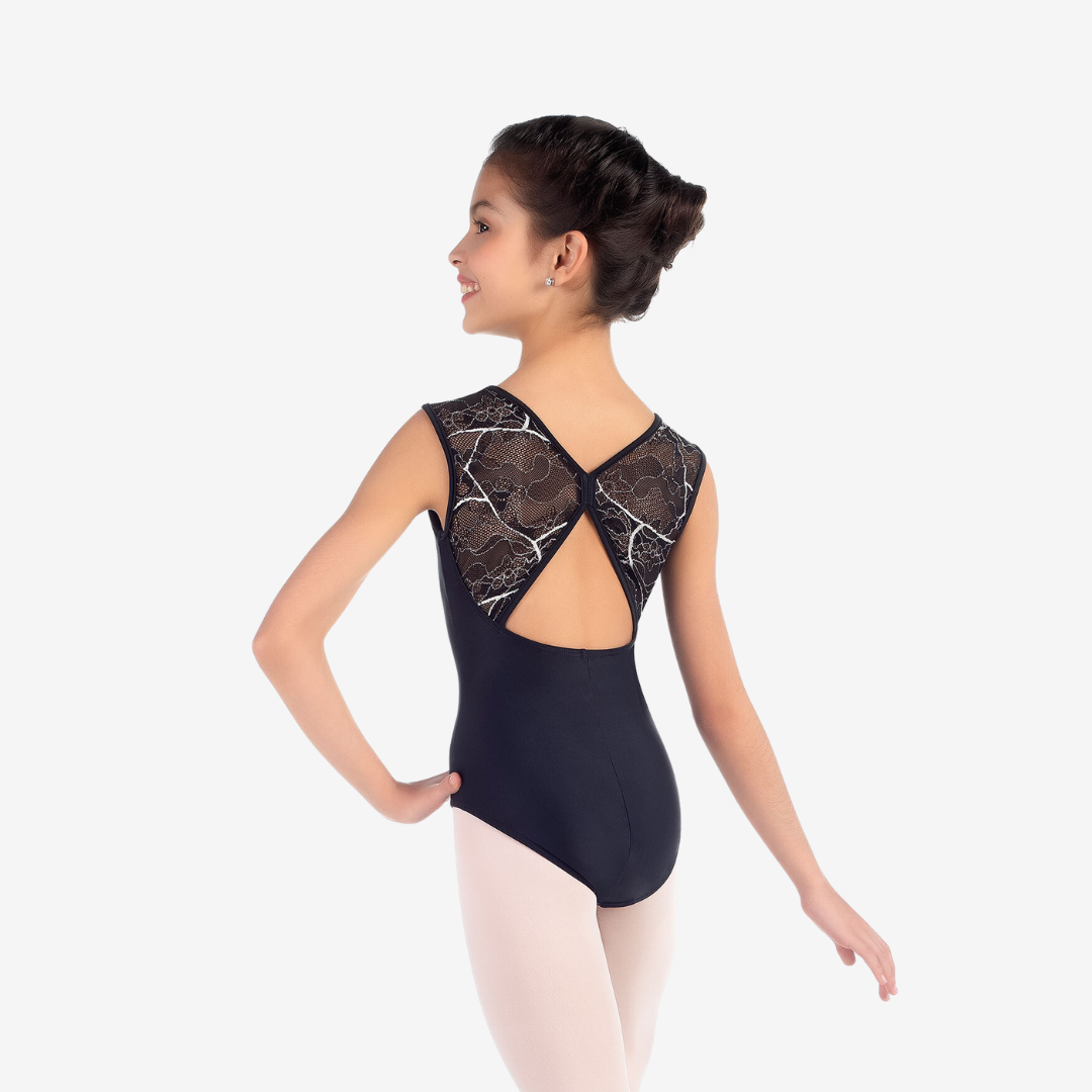 Child Cap-Sleeve Leotard with Lace Shoulders & Cross-Back Keyhole