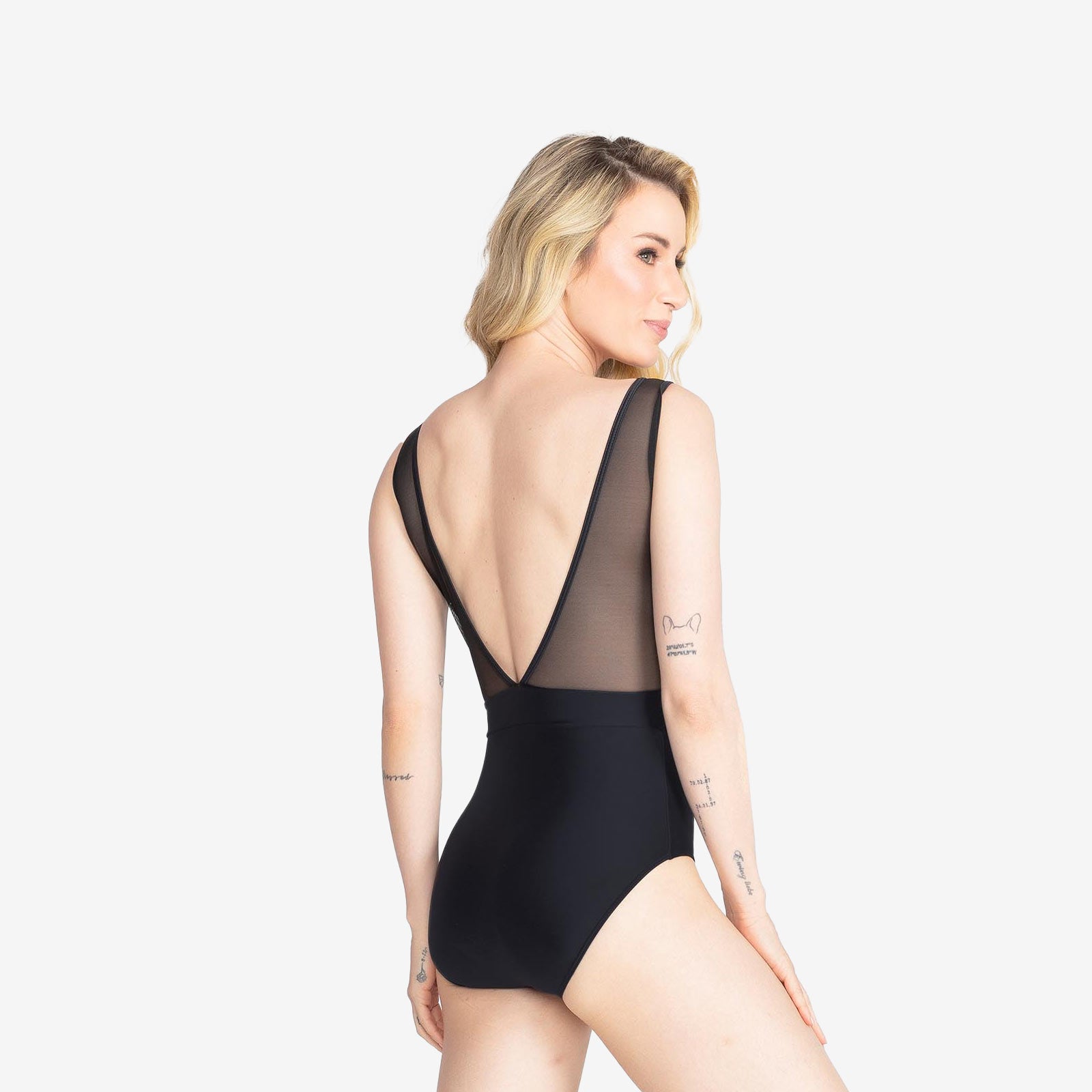 Sharp lines, soft feel. Jhennifer’s asymmetric front seam and wide waist panel sculpt the torso, then a dramatic sheer V-back adds just-enough drama. Sleek, stretchy, and totally stay-put—made for clean class lines and performance polish.