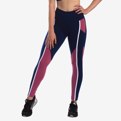This thick fitness material of the high waisted leggings is crafted to be sweat and squat proof, guaranteeing a secure fit for any workout. Get ready to crush your workout in these eye-catching leggings! The bold color-block design in navy, metallic pink, and white stripes adds a serious dose of style to your fitness routine. You'll feel both supported and unstoppable as you move!