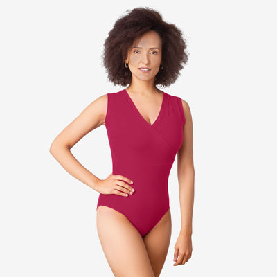 Once on, it's a nice looking leotard, and it does fit my plus size body well, but the cut/design makes it very hard to get the arms through while trying to either pull this thing on or off, at least not without some shoulder flexibility.